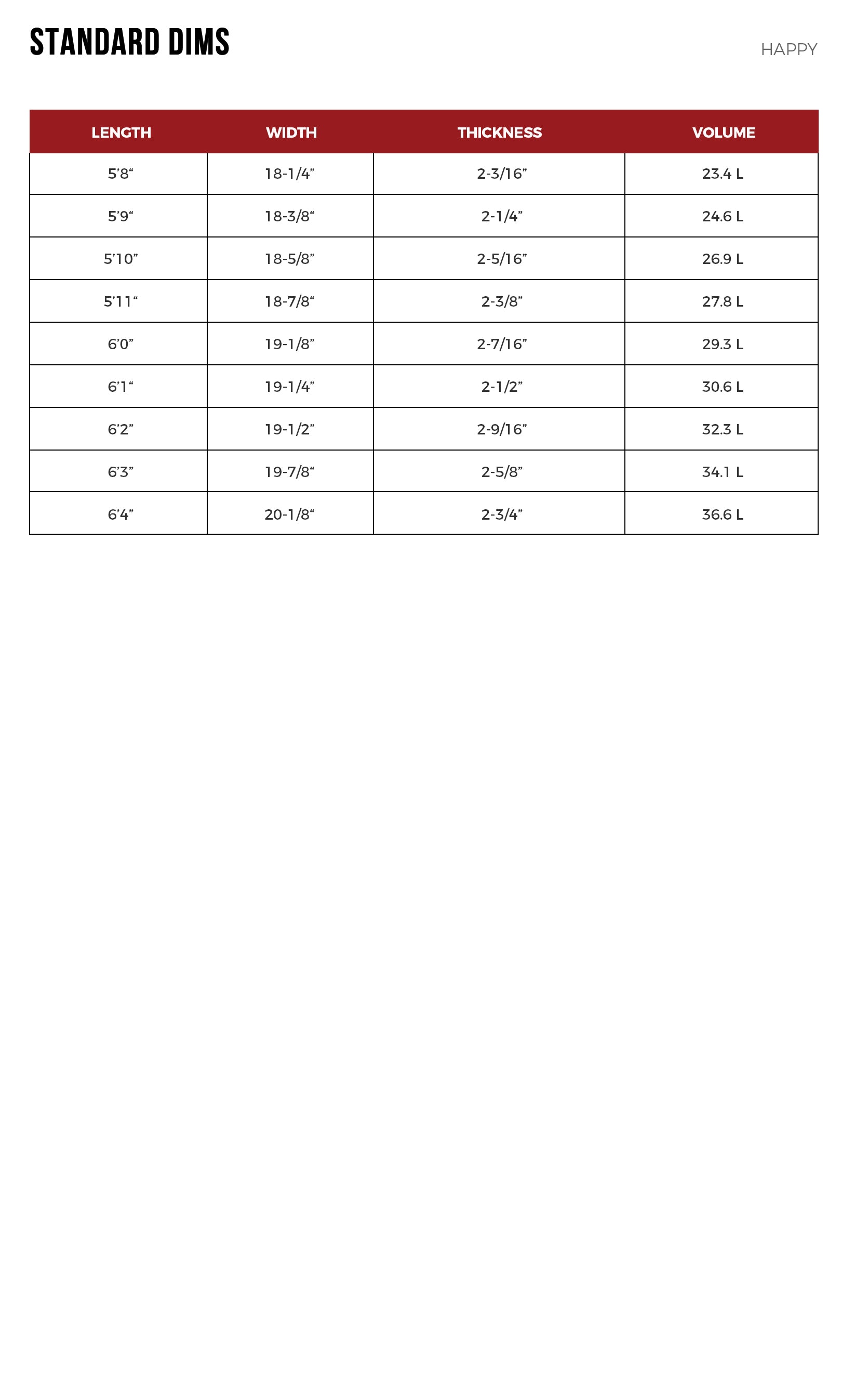 5’7” x 18 7/8 x 2 5/16 Liters 25.5